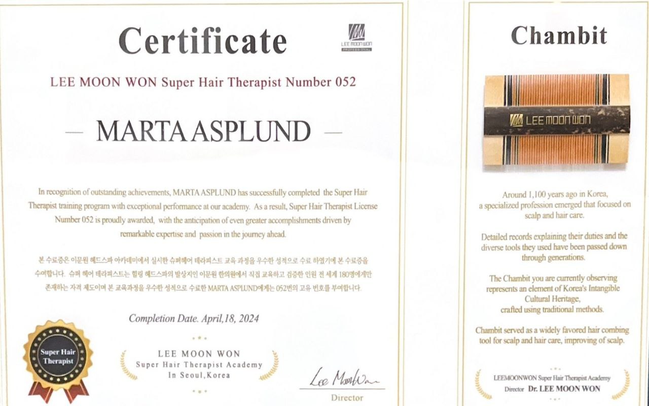 As one of only 10 specialists worldwide trained at Dr. Lee’s Korean Clinic of Traditional Medicine & Trichology, Marta stands among a select group of professionals with advanced expertise in scalp and hair health.