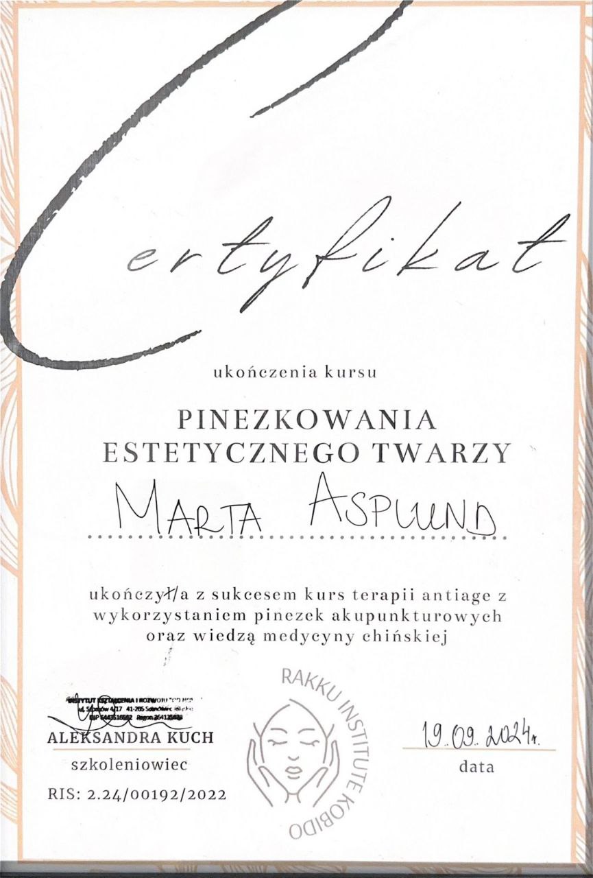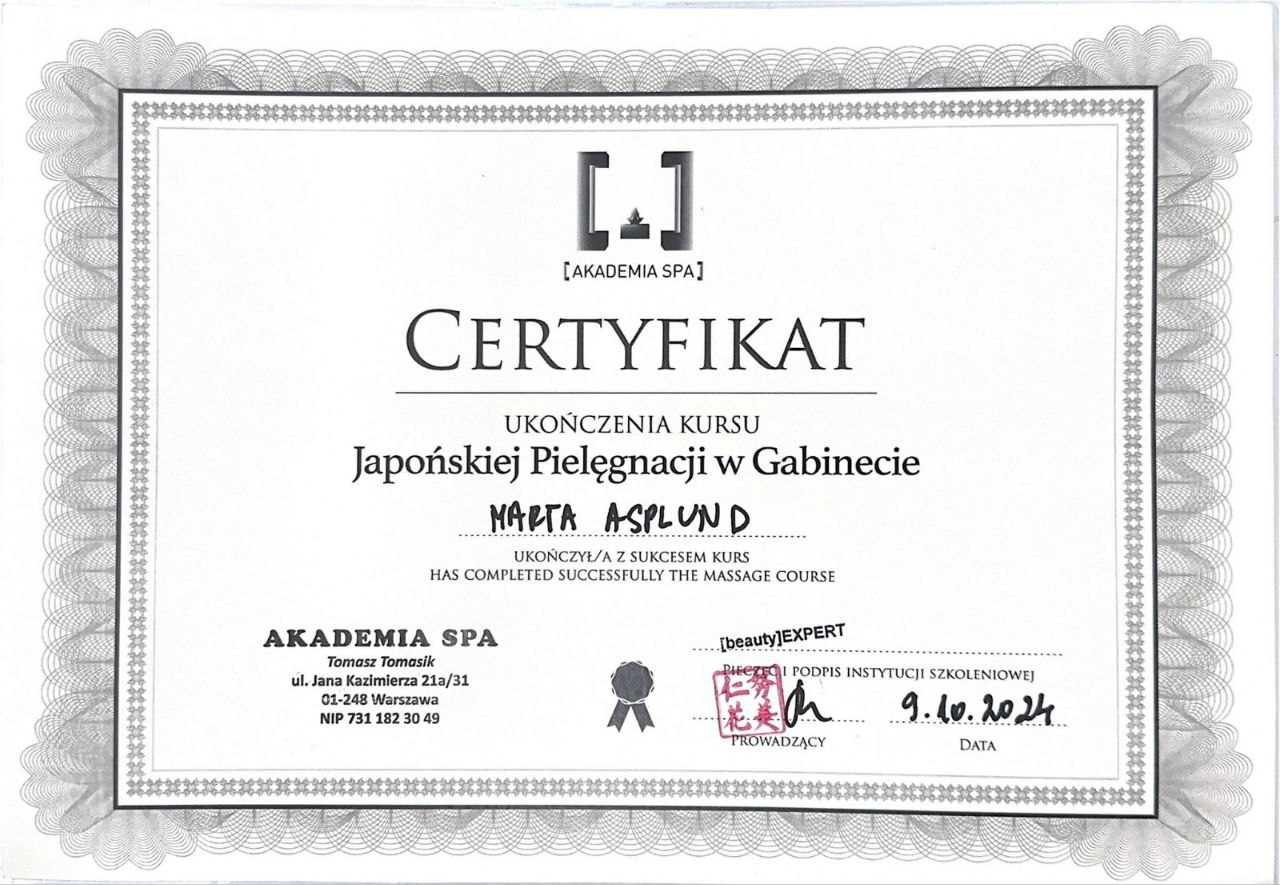 Japanese Head Spa Trainer | Specialist in Scalp Therapy, Trichology & Holistic RelaxationMarta Asplund is an internationally certified Head Spa specialist and educator, known for her refined sensory approach, deep understanding of scalp health, and holistic method focused on nervous system regulation and hair vitality.